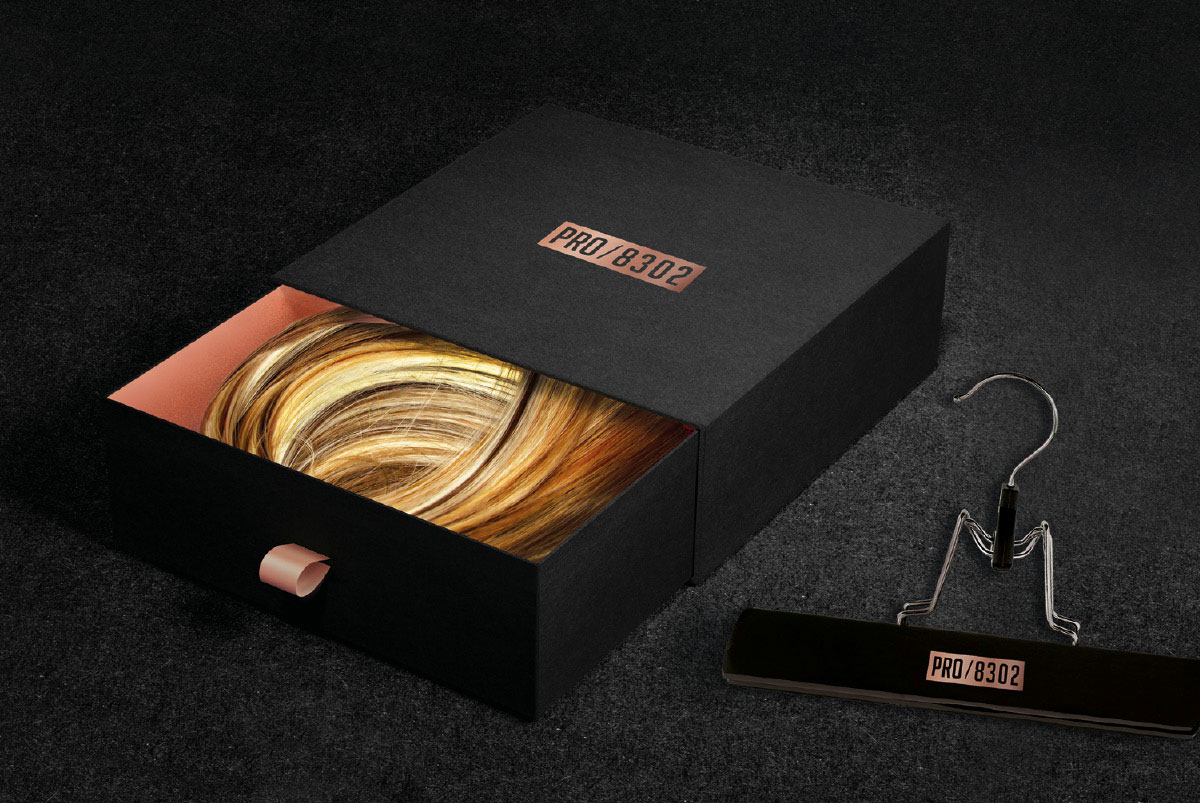 PRO/8302 Weft-Extensions-Aufbewahrungsbox Logokreation PRO/8302, Konzeption, Verpackungsdesign, Produktvisualisierung Rolph Ag Zürich PRO/8302 Extensions Aufbewahrungs-Box Extensions Aufbewahrungsbox Visualisierung Präsentation back